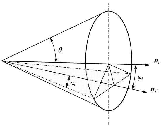 Force-closure grasping belongs to the non-critical state of force equilibrium grasping [35]. For grasping that satisfies force equilibrium, force closure can be achieved simply by increasing the friction coefficient at the contact points. Therefore, for grasping that has achieved force equilibrium, if the coefficient of friction increases, a non-critical force equilibrium can be achieved, that is, force closure. To reduce the computational load, we can first consider transforming the force-closure conditions for a four-finger grasp in space into two-dimensional force-closure conditions, and then simplify the two-dimensional force closure to force-equilibrium conditions. There are three possible relationships between the friction cone between the contact planes and the contact points: intersecting, tangent, and disjoint. When a friction cone intersects with a contact plane, the intersecting portion is called the friction fan [36], as shown in Figure 2.