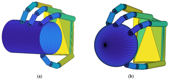 To verify the efficiency of the recommended spatial four-finger force-closure grasping algorithm, force-closure calculations were performed for spheres and cylinders, as shown in Figure 4.