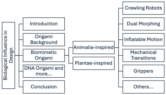 This paper embarks on a journey through the interdisciplinary realm of origami inspired by biology. It is guided by a taxonomic approach, organizing biologically-inspired origami structures according to two categories: first, the kingdoms of life, consisting of Animalia and Plantae; and second, DNA origami (Figure 1). A mosaic of folding patterns and design principles is seen within each of these categories, reflecting the morphological features, behaviors, and ecological adaptations of organisms. As described by Nojima et al. [3], living organisms can be used as a guide in research to develop shape-changing origami models.