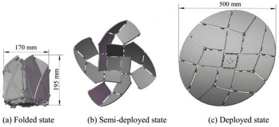 - Koryo, M. Method of packaging and deployment of large membranes in space. In The Institute of Space and Astronautical Science Report; The Institute of Space and Astronautical Science: Sagamihara, Japan, 1985; pp. 1–9. [Google Scholar]