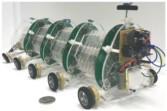 Similarly, the Origami Robotic Snake (OriSnake) by Luo et al. [23] is a soft robotic platform for search-and-rescue applications. Unlike traditional snake robots that use links and joints, OriSnake uses tubular origami continuous sectors driven by inner cords and electric mechanisms for distributed actuation, sensing, and control. Modeled after real snake movements, OriSnake’s lateral undulation and sidewinding gait allow it to move in 3D spaces. Experimental results show that OriSnake can move at 40.5 mm/s in lateral undulation gait and 35 mm/s in sidewinding gait. Its light weight, low cost, and origami-based flexibility enable it to navigate through narrow spaces and 3D terrain (Figure 8) [23]. Zuo et al. [24] presented another snake-shaped robot; inspired by waterbomb origami concepts, their design includes modular joints with flexible hinges and soft rubber material, and can bend and deform through lasso constructions. Kinematics modeling and control system implementation allow it to move on various surfaces.