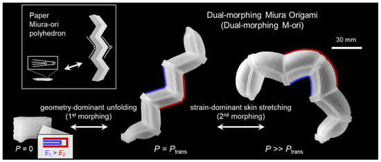 - Kim, W.; Byun, J.; Kim, J.K.; Choi, W.Y.; Jakobsen, K.; Jakobsen, J.; Lee, D.Y.; Cho, K.J. Bioinspired dual-morphing stretchable origami. Sci. Robot. 2019, 4, eaay3493. [Google Scholar] [CrossRef] [PubMed]