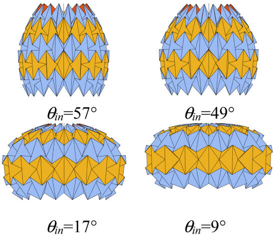 The flasher origami pattern, as discussed by Jang et al. (Figure 5) [15] is distinguished by its dynamic radial folding pattern, which allows for a special transition between two-dimensional (2D) and three-dimensional (3D) states. Its most remarkable characteristic is its capacity to stretch and contract outward from a central core, producing a flaring or “flashing” movement. This mechanism is perfect for applications that need to expand quickly, such as satellite structures or deployable shelters, as it can be used to create large-scale structures from a compact shape. Furthermore, the flasher design allows for seamless transitions between 2D and 3D shapes, offering flexibility for mechanical, architectural, and creative applications where adaptability and space efficiency are critical.