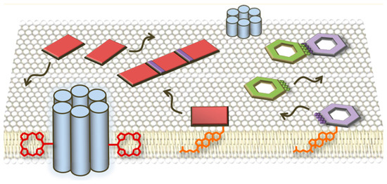 In an article published in ACS Nano, Suzuki et al. [64] demonstrated how lipid-bilayer-anchored DNA origami structures can be combined into specific structures that resemble the lively congregation of protein clusters necessary for cellular membrane deformation, highlighting a significant advancement in DNA nanotechnology. This opens the door for DNA nanostructures to be applied in artificial cells in the future, with applications spanning biotechnology and nanomedicine. The reversibility of assembly reactions and speed are two main challenges in these assemblies. It is crucial to understand how DNA origami structures behave and interact with biological membranes in order to build DNA-based artificial cellular components in the future. Because DNA molecules are extremely programmable, there is a plethora of fascinating options for replicating cellular activities with DNA nanostructures, allowing for innovative study in this area (Figure 26) [64].