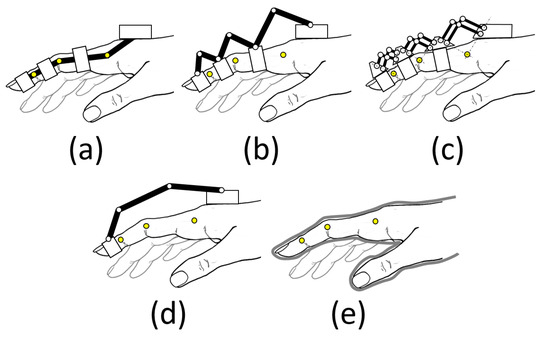 In cases (i) and (ii), the location of the mechanism can be either dorsal (located on the dorsal part of the fingers, Figure 1b–d), palmar (on the palmar part of the fingers, hardly used because they interfere with interacting with objects [16]), or lateral (Figure 1a). Lateral devices leave the palm of the hand free and therefore allow objects to be grasped. In addition, they allow patients to see their hands, which is important for visualizing progress during rehabilitation. In any of the three arrangements, the mechanism is attached to the hand via Velcro®, flexible straps, or thimbles.
