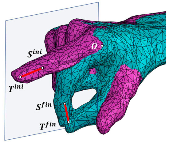 The synthesis to be performed involves two positions (initial and final) of the ST segment corresponding to the pulp pinch grasp (Figure 4). As has been mentioned before, let us designate and as the points that make up this segment in the initial position. Analogously, and correspond to the final posture.
