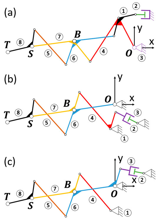 Multiple four-bar linkages, made up of a series of concatenated crossed four-bar mechanisms, are complex assemblies where the motion is transferred through a sequence of interconnected four-bar linkages, enabling the design of intricate mechanical systems with sophisticated movement capabilities. This versatility has led to significant innovation and a variety of designs. Our research group has experience in applying different topologies for the design of prosthetic devices, such as the Toronto/Bloorview/MacMillan (TBM) [57,58], consisting of two coupled four-bar mechanisms. The proximal one is coupled with a crank–slider mechanism in its first inversion (cylinder being fixed), with the crank being part of link 4 and the coupler being part of link 1 (see Figure 3a). This results in having a linear actuator as input, and the proximal four-bar mechanism involves links 1-4-6-7. This inversion of the crank–slider implies having the linear actuator integrated within the ground bar (links 1 and 2 at the dorsum of the hand). The RML (Robotics and Mechatronics Lab of the Virginia Tech University, Blacksburg, Virginia, United States) [59] has a similar topology, although the crank–slider providing a linear input is in its third inversion (the coupler link (1) of the crank–slider is fixed). In this mechanism, the proximal four-bar mechanism also involves links 1-4-6-7, although link 1 is the ground at the dorsum of the hand. The third inversion of the crank–slider gives the designer more freedom to optimize the location of the actuator for improved performance (see Section 2.3.3). In addition, the crank is an extension of link 6 (Figure 3c) instead of link 4 (Figure 3b), which becomes a quaternary link. This last variation has the advantage of leaving more spare space at the level of the hand, preventing any interaction and allowing the user better visual feedback. For all these reasons, RML topology was used for the forthcoming RHEx design. All these topologies have one degree of mobility for the 8 links involved.