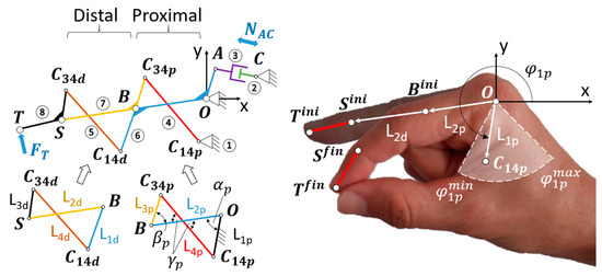 In the process of synthesizing the two four-bar mechanisms within the linkage, let us consider a recurrent nomenclature for both, the proximal and distal ones concerning the patient’s hand (see Figure 4). The segments of each four-bar mechanism are named from to , indicating with the subscript or whether they belong to the proximal or distal mechanism, respectively. Segments (belonging to link 6) and (belonging to link 7) are articulated in , where both four-bar mechanisms are concatenated through the relative movement of segments (also belonging to link 6) and (also belonging to link 7).