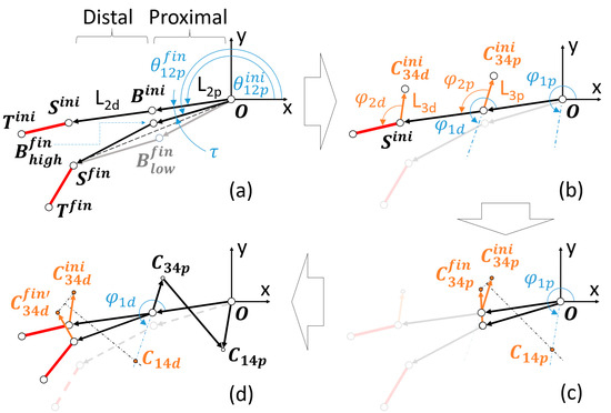 By squaring the Equations (5) and (6), adding them, and using the fundamental trigonometric identities, the dependence on the angle is removed. This allows obtaining the value of as a function of . The distal four-bar mechanism can be solved analogously. Thus, for each value of and its variation (), the values of , and their variations (, ) are known univocally. It allowed us to find the displacement required in Equation (3).