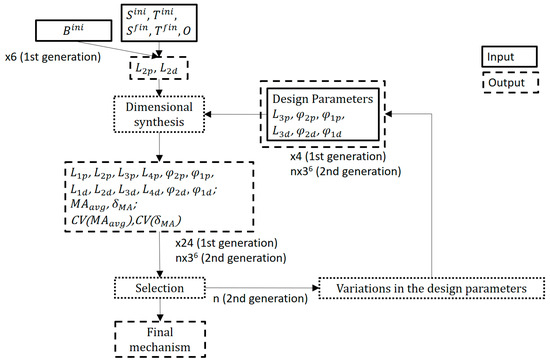 A genetic scheme was adopted for the present study, in two stages (thus having two generations) with two different targets. The first step was to provide discretion to the optimization in order to reduce the study population. To this end, the relevance of the location of the B-joint ( Figure 5a) between the proximal and distal four-bar mechanisms was studied, resulting in a pre-selection. Next, the influence of the variation in the values (dimensions) of the different lengths and angles set for the synthesis of the mechanism was investigated. Figure 6 summarizes the two generations in which, in the first instance, the localization was optimized by studying a population of 24 mechanisms, on which a first selection was made. In the second generation, the mechanisms resulting from varying certain design parameters in the selected mechanisms were studied.