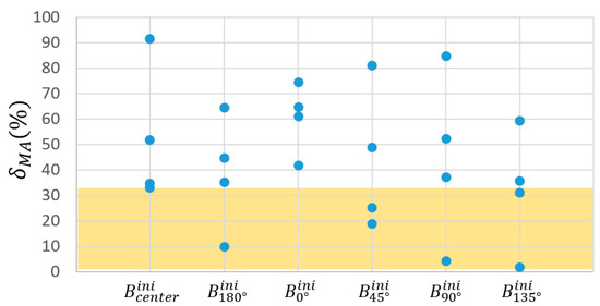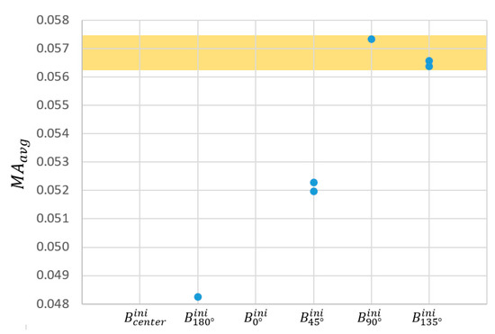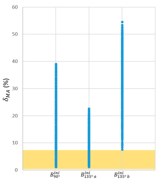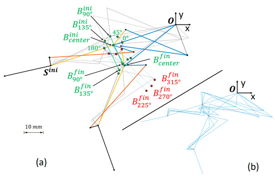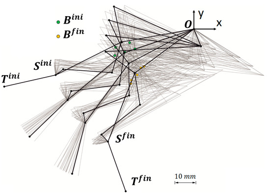 The initial synthesis process, explained in Section 2.3.1, is valid for any of these relocations of . Given the complexity of the mechanism, it was likely that any attempt to select values between the limits of Table 2 would result in a non-existing solution in either of the four-bar mechanisms. Instead, it was decided to generate random values between these limits, guaranteeing the existence of solutions through the stages of the synthesis (proximal four-bar, followed by the distal one) by performing iterative calculations until a valid solution was found. Four simulations were run for each hypothesized point to have a sufficiently diverse population (see Figure 7b).