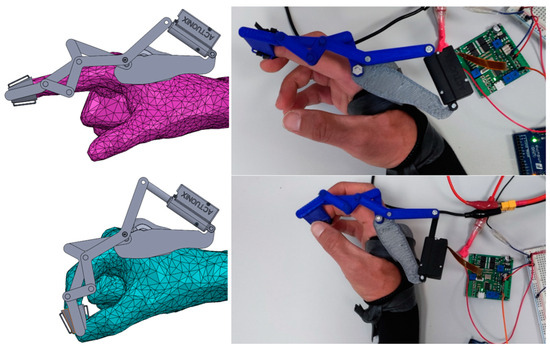 - Those restraining each phalanx (Figure 1a–c), using mechanisms to match the axes of rotation with those of the phalanges. They strictly limit spasticity during rehabilitation. However, the complexity of the design increases as higher finger mobility is sought.