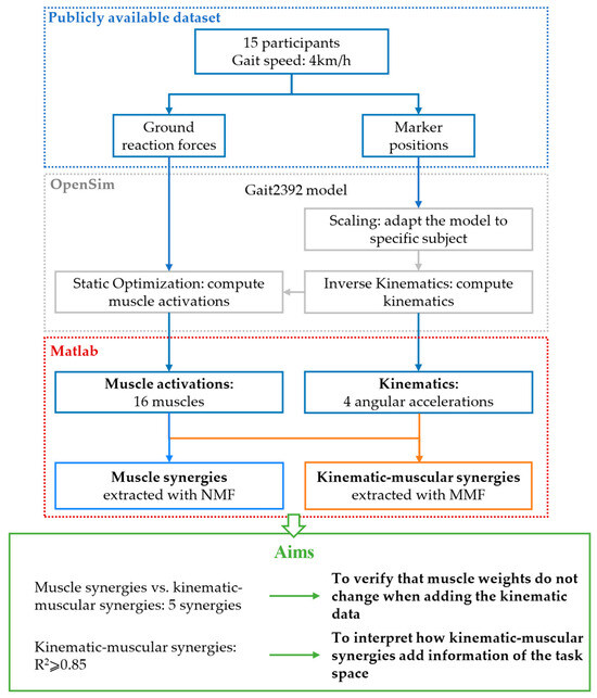 Scheme of the work. Markers’ position and ground reaction forces from a publicly available dataset are used as input for musculoskeletal simulations in OpenSim. The outputs of the model are kinematics and muscle activations. In total, 16 muscle activations are used for extracting muscle synergies with NMF and the same muscle activations with 4 angular accelerations are used for extracting kinematic–muscular synergies with MMF. Then, five kinematic–muscular synergies are compared to five muscle synergies to demonstrate that the muscular weights do not change when adding kinematic data. Finally, a number of kinematic–muscular synergies achieving R2 ≥ 0.85 are extracted to show that they add information from the task space.
