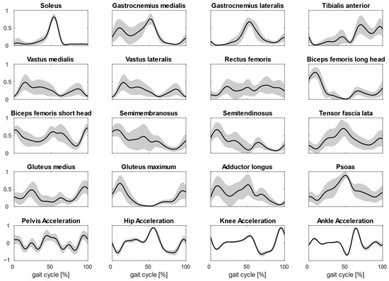 Plots show the averaged normalized activations of the 16 muscles considered during gait. The muscle activations are averaged on four steps and for all subjects. In the last row, joint accelerations used for MMF are shown too.