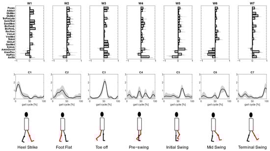 Kinematic–muscular synergies extracted with R2 ≥ 0.85 were grouped into 7 clusters so that the intra-cluster similarity is greater than 0.70 for all clusters (upper panel). The synergies activation coefficients are ordered following the gait cycle (lower panel). The third line represents the biomechanical function associated with the walking task.