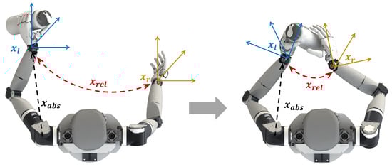 Let , , and represent the frames fixed to the left and right EE and the robot base link. The subsequent upper-left or lower-right corner label represents one of the three aforementioned coordinate frames. and denote the rotation and translation of the frame with respect to . Additionally, and are the corresponding velocities. Let in which denotes the left- or right-arm Jacobian mapping joint space velocities to EE velocity , i.e., . According to the rigid-body kinematics [], the relative velocity of the right EE with respect to the left EE is calculated as follows: