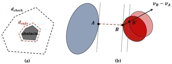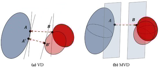 As shown in Figure 5b, A and B are the witness points (closest points) on two convex geometries. Let in which is the unit direction vector from the witness point A to B. If , the distance between two points will increase in next time step; otherwise, it will decrease.