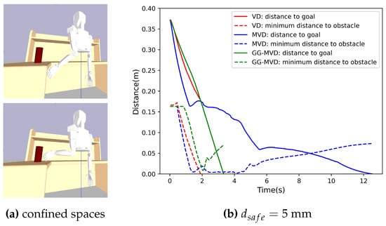 where is a function mapping a rotation matrix to the corresponding rotation axis. As for the GG-MVD method, the direction is determined by reference waypoints obtained from a global planner. For a fair comparison, the magnitudes of EE velocity are set to be the same. In this experiment, we choose m/s and rad/s. Figure 7b illustrates the experiment result when a small safe distance mm is adopted. Solid lines represent distances between EE and the goal pose, while dashed lines represent the minimum distances between the robot and the obstacle. The VD method failed at 1.92 s with the robot hand colliding with the desk. This is because the small interactive distance required in a confined environment cannot provide enough safe margin for VD constraints. The MVD method, however, succeeded without collision even though the robot was in an extremely close distance to the obstacle at 1.36 s∼4.63 s. It demonstrates the effectiveness of the stricter rotation constraints defined by MVD. When the distance between two convex geometries is equal to or less than the safety distance, these constraints propel that the witness points on each object remain the same in the next time step. Consequently, there is barely any penetration to the collision safe boundary. Notably, it takes only 3.32 s for the GG-MVD method to finish this task, almost 3.7× faster than MVD. With the full task horizon, the global planner exploits a feasible workspace and generates a more efficient reference trajectory. This trajectory not only avoids the area where low-speed motion or a local minimum occurs due to obstacle avoidance, but also exhibits a shorter overall length.