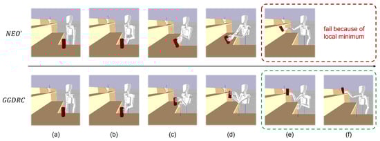 Different motions of a dual-arm robot generated by NEO’ and GGDRC in the pick–handover–place task: (a) start configuration, (b) object grasped by the left hand, (c) two hands approaching each other, (d) object self-handover, (e) dual-arm independent motion, and (f) object placed on the shelf. NEO’ failed in this task because of the local minimum, while GGDRC succeeded with the global reference trajectory of the object.