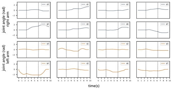 Joint angles of the whole pick–handover–place process with two arms plotted separately. There are two vertical dashed lines in every subplot. The first line represents the moment when the left robot hand grasps the object; in the meanwhile, the global planner starts to generate the reference trajectory of the object. The second one denotes that self-handover takes place, and the object is transferred from the left hand to the right hand.