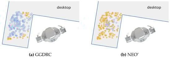 A repetitive experiment consisting of 200 trials is also conducted to demonstrate the robustness of GGDRC. The start position of the target object is randomly sampled from the left area of the desktop, as shown in Figure 10, followed by the same pick–handover–place procedure. The object is transferred to the same end position. In every trial, two methods (GGDRC and NEO’) are both tested. Any collision or runtime exceeding 25 s is assumed as failure.