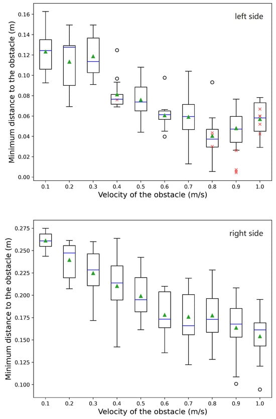Distribution of minimum distance from the robot to the moving obstacle with different velocities. Obstacle approaching (Top) from the left side; and (Bottom) from the right side. For each value of velocity, a boxplot shows the distribution of 15 data points. The upper and lower whiskers are based on a 1.5 IQR value, and outliers are indicated by hollow circle markers. The blue middle line across the box denotes the median value, and the green triangle denotes the arithmetic mean value of valid trials. In addition, the red cross markers represent failed trials because of collision.