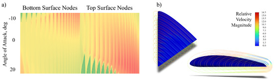 Velocity magnitude (not direction, as many AHS types are isotropic [19] and many natural flow-sensing systems measure only velocity [48]) was calculated at 0.5 cm, 1.0 cm, and 2.0 cm above the surface along 11 chordwise slices of the wing (Figure 2). This resulted in a three-layer shell of velocity data from which data sets were extracted with variable AHS height at 238 nodes (candidate sensor locations) over the top and bottom surfaces of the wing (Figure 3). This allowed SSPOP analysis for three fixed-height cases as well as a variable height case, which corresponded to real-world AHSs in which the length of the hair may be tuned during manufacturing or installation to account for different sensitivities [31,49]. Nodes were spaced approximately 1 cm apart.