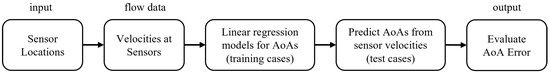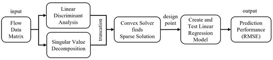 The SSPOP algorithm bypasses this combinatorial problem by greatly reducing its dimensionality. SSPOP (Figure 4) uses singular value decomposition (SVD) and linear discriminant analysis (LDA) to identify a sparse set of sensor locations (a design point (DP)) at which most of the information from the flow may be obtained. It begins with SVD of the near-surface velocity magnitude data to identify prominent flow field features and create a low-rank approximation of the original data set. The data are then truncated using a weights matrix via LDA based on the variances of the original data. The highly truncated data sets contain well over 95% of the information of the full dataset. A convex solver then creates the final sensor matrix and identifies the corresponding DP. Finally, linear regression of velocity data at the DP sensor locations is performed to obtain a root mean square error (RMSE) of prediction for any flight parameter (for example, angle of attack, ). It should be emphasized that SSPOP DP is application agnostic; the algorithm selects the most information-rich DP regardless of what that information will be used to predict. The RMSE between the original data (CFD simulation) and the sparsely calculated linear regression prediction is the performance metric of the DP. To determine its proximity to optimality, the performance of the SSPOP DP in terms of predictive accuracy was evaluated through comparison with all possible DPs found by a brute-force search. Analysis by this method is limited to low Q, especially when N is large. Once validated in general, the predictive performance of any SSPOP DP can be used to baseline a search of all possible DPs for a given model. See Section 5 for a link to supplementary information including the Matlab code and detailed flow chart for the SSPOP algorithm.