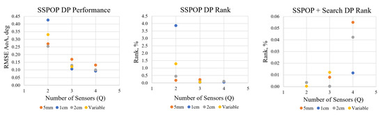 Based on these results, it is evident that a GS can yield a top-one-percent result, especially at higher Q values, but some form of validation would be required to confirm this for each model. We have shown in [20] and above that SSPOP reliably finds a top-one-percent solution, regardless of model, in both 2D and 3D for two or more sensors. The two approaches may be used together, as done earlier with SSPOP + Search. The SSPOP + GS would first run SSPOP to establish a goal, and either a GS or simple search, or both, could be run to seek improvement. From Figure 8, it is evident that the SSPOP + Search approach delivers diminished returns as Q increases, due to the exponentially increased design space at larger Q. Therefore, for very large models, it may be sufficient to simply keep the SSPOP DP without additional searches.