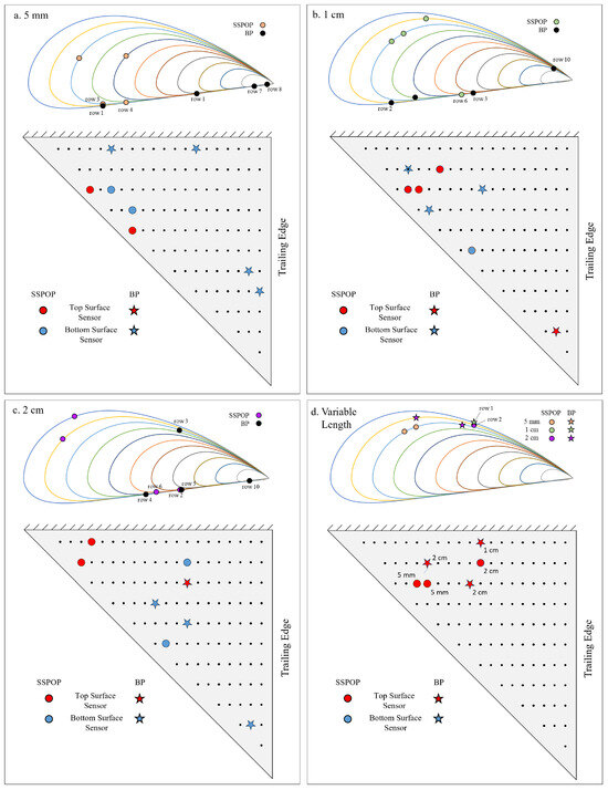 Figure 6 depicts the sensor locations for the SSPOP and BP DPs. Each row represents a chordwise slice, with Row 1 nearest the wing root and Row 11 nearest the wing tip. The thickness of the NACA 4415 airfoil was exaggerated by a factor of four to facilitate visualization. The BP DP was found for up to four sensors for each fixed hair length case. The variable hair length case was only characterized for three sensors because the design space (238 nodes × 3 lengths = 714 variables and 10,738,066,626 DPs for a four-sensor solution) was too large for a brute-force search. The SSPOP DPs for all single-length models (a–c) included multiple sensors near the leading edge, while the BP sensor locations were, on average, closer to the trailing edge. The single-length BP DPs tended to include sensors in more extreme locations, nearer the wingtip and trailing edge. However, the SSPOP DPs were more likely to include neighboring sensors. The variable length model (d) featured the closest agreement between the SSPOP DP and the BP DP. Two-thirds of the SSPOP sensors were located on the top, compared with only one-third of the BP sensors.