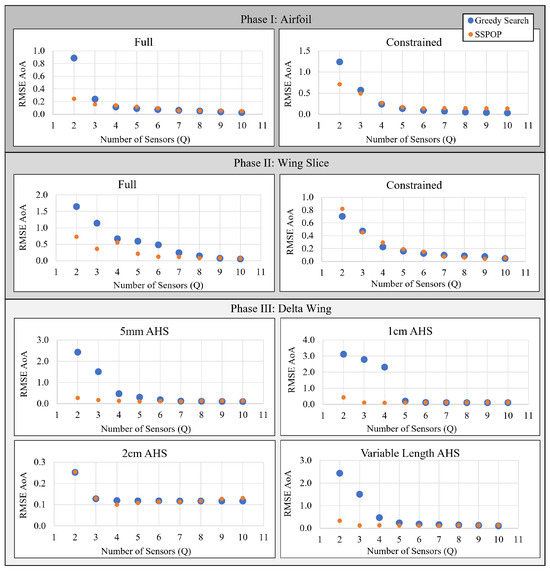 Figure 7 plots the predictive performances of the SSPOP and GS DPs for one through ten sensors for an airfoil model and 2D slice of a wing (model from [20]), and the 3D wing of the present study. In most cases, the SSPOP solution outperforms the GS solution, especially at lower Q. In other instances at low Q, and in all cases for high Q, the GS solution approximately matches the SSPOP solution. In no case does the GS solution significantly outperform the SSPOP solution.