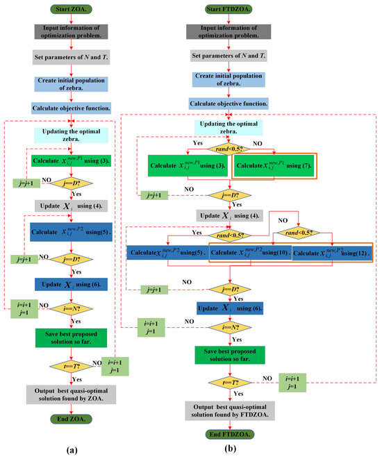 (a) The flowchart of ZOA algorithm. (b) The flowchart of FTDZOA algorithm.