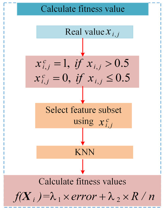 Since the individual information is always real-valued during the iterative process of FTDZOA, but due to the discrete type of the FS problem, it is necessary to convert the real-valued value to discrete-valued operation for the individual before calculating the fitness value, and the specific flowchart for calculating the fitness value is shown in Figure 4, with the main steps as follows: