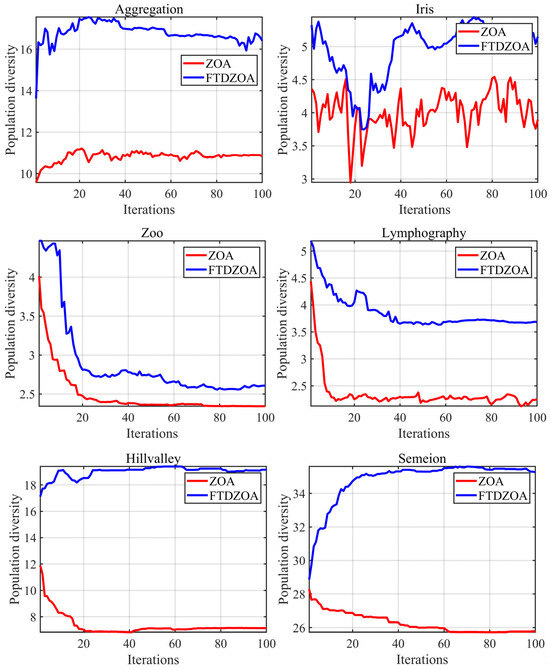 In this section, we mainly analyze the population diversity of the FS method based on FTDZOA in solving the FS problem, and the higher population diversity indirectly reflects the algorithm’s ability to jump out of the locally optimal feature subset, which means that the algorithm is able to explore a wider subset of the optimal feature region and effectively eliminate the redundant features from the original dataset. The experimental results are shown in Figure 5, where the X-axis represents the number of iterations and the Y-axis represents the value of population diversity.
