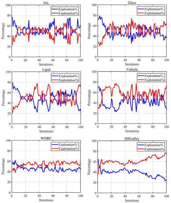 In this section, we mainly analyze the exploration–exploitation phase of the FTDZOA-based FS method when dealing with FS problems, in which the main purpose of the exploration phase is to explore the optimal region in the vast solution space, while the main purpose of the exploitation phase is to carry out a deeper step in the discovered optimal region to speed up the convergence speed and convergence accuracy. A good algorithm should achieve a good balance between these two phases in order to make the exploration and exploitation phases complement each other and jointly promote the performance of the algorithm. The experimental results are shown in Figure 6, where the X-axis represents the number of iterations and the Y-axis represents the proportion of exploration/exploitation phases in the running process.