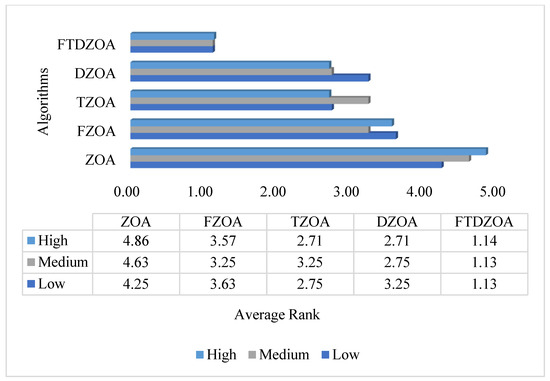 Population diversity and exploration–exploitation capabilities during FTDZOA execution have been analyzed in the above subsections, but we have no way of knowing the improvement in algorithm performance for a single strategy. In this section, the effectiveness of the strategies is mainly evaluated: firstly, the fractional order search strategy is introduced into ZOA to form the algorithm FZOA, the triple mean point guidance strategy is introduced into ZOA to form the algorithm TZOA, and the differential strategy is introduced into ZOA to form algorithm DZOA. At the same time, the above three strategies are introduced into ZOA to form the algorithm FTDZOA. Subsequently, the FS performance of ZOA, FZOA, TZOA, DZOA, and FTDZOA is evaluated on 23 FS datasets, involving high dimensionality, medium dimensionality, and low dimensionality. The experimental results are shown in Figure 7, which shows the average ranking of the algorithm based on the fitness values on different dimensional datasets. From the figure, it can be seen that the introduction of the fractional order search strategy in ZOA avoids the jumping phenomenon that may occur in the traditional integer order search, and at the same time utilizes the individual history information and enhances the exploitation ability in the local area, which makes the average ranking of FZOA better than that of the original ZOA in different dimensional datasets. Meanwhile, the introduction of the triple mean point guidance strategy in ZOA avoids the limitation of the traditional mean point and strengthens the ability of the algorithm to jump out of the local optimal trap by combining the randomness and optimality of the strategy, which makes the average rankings of TZOA outperform those of the original ZOA on different dimensional datasets. The introduction of a differential strategy in ZOA improves the global search performance of the algorithm and enriches the optimal solution region of the problem due to the learning of individuals by learning from the differences in information from other individuals, which makes the average ranking of DZOA better than that of the original ZOA in different dimensional datasets. We can notice that the exploitation performance as well as the global search performance of FTDZOA is improved after the introduction of the above three strategies simultaneously in ZOA, and the average rankings on different dimensional datasets are optimal. Through the above analysis, we can conclude that the introduction of a fractional order search strategy, triple mean point guidance strategy, and differential strategy in ZOA alone can improve the performance of ZOA from different angles, which confirms that the proposed strategies in this paper are all effective. Meanwhile, we can find that the performance of ZOA can be improved by introducing the above three strategies at the same time.