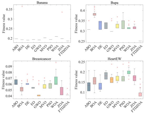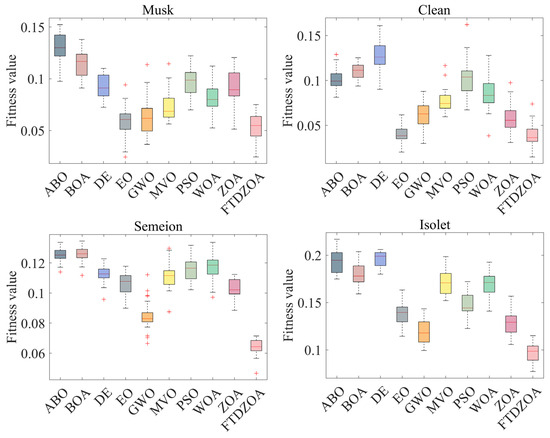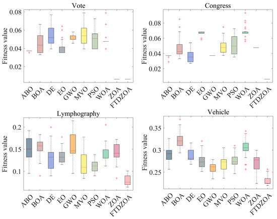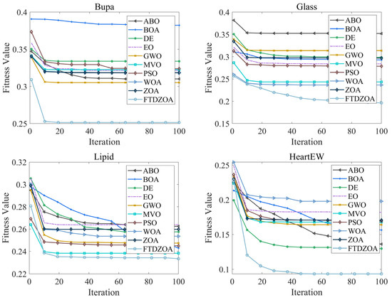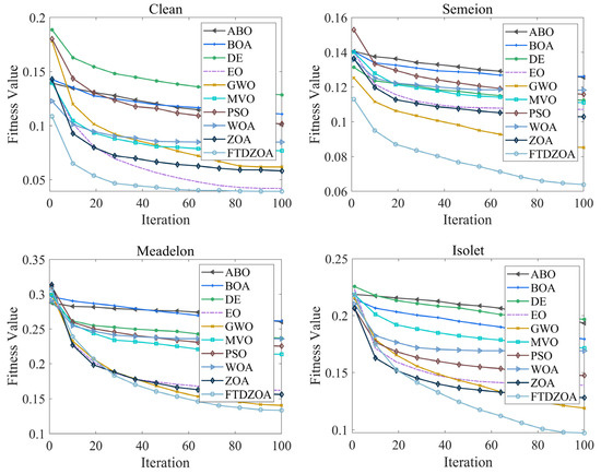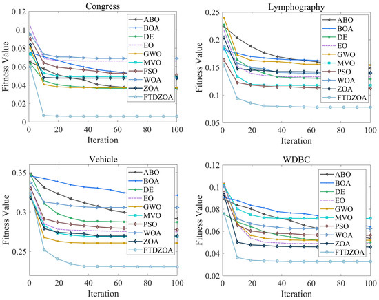 It can be seen in Figure 12 that all the algorithms can effectively reduce the fitness value when solving the low-dimensional FS problem, and it is worth noting that in the 10th iteration, the FTDZOA has taken a clear convergence advantage in convergence accuracy, possessing faster convergence speed, which is mainly due to this paper’s fractional order search strategy, which enhances the local development ability of the algorithm, improves the convergence speed, and enhances the practicality of the algorithm. After the 10th iteration, FTDZOA still optimizes the FS problem steadily, which is mainly due to the introduction of the triple mean point guidance strategy, and differential strategy, which strengthen the global search ability of FTDZOA and further illustrates FTDZOA’s reliability. Through the above analysis, it is confirmed that when solving the low-dimensional FS problem, FTDZOA has the advantage of convergence performance due to the introduction of the learning strategy, which makes it more practical and reliable.
