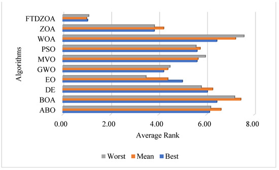 Combining Table 7 and Table 8, it can be seen that when solving the low-dimensional FS problem, all the algorithms can effectively downscale the redundant features of the original dataset and thus improve the classification accuracy, but it is worth noting that FTDZOA achieved excellent feature downsizing performance by having the first accuracy rate on 88% of the low-dimensional FS problem, but it is undeniably weaker than GWO in the Breastcancer dataset, which also reflects that there is still room for improvement of FTDZOA in some specific datasets. Meanwhile, through Table 8, we can find that the feature subset size obtained by FTDZOA is not dominant, which is mainly due to the fact that other algorithms eliminate the useful feature information, thus obtaining a smaller feature subset size, but the classification accuracy is greatly reduced. This also proves that the FS method based on FTDZOA has better global optimization ability, which can effectively jump out of the local optimal feature subset and improve the classification accuracy. When solving the medium-dimensional FS problem, FTDZOA has an accuracy rate of 63% in the medium-dimensional FS problems and the first overall ranking; although the winning rate is reduced, it still has a good solving advantage compared with other algorithms. It can be noticed that FTDZOA is not as effective as other algorithms in Zoo, WDBC, and BreastEW datasets, which indicates that FTDZOA still has the problem of falling into the locally optimal subset of features when solving certain FS problems, which is due to the increase in the dimension of the FS problem, resulting in the complexity of the search space. However, FTDZOA still has the best performance in the medium-dimension FS problem compared with the other algorithms. Compared with the other algorithms, FTDZOA still occupies a certain performance advantage in the middle-dimensional FS problem. When solving the high-dimensional FS problem, it can be seen that the solution performance of the other algorithms is greatly affected due to the sharp increase in the problem dimension, while FTDZOA still achieves excellent results by winning first place with a probability of 72%. It is weaker than DE and EO only in the Musk and Clean datasets. However, it is undeniable that from a comprehensive point of view, FTDZOA occupies a great advantage in solving high-dimensional FS problems. In summary, although FTDZOA does not perform as well as other algorithms in a few specific FS problems, from a comprehensive point of view, FTDZOA can be regarded as a FS method with efficient solution performance, good global optimization performance, and effective removal of redundant features from the dataset.