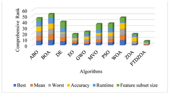 The reliability, stability, and practicality of the FS method based on FTDZOA have been verified in the previous subsections, and in this subsection, the main focus is on the comprehensive analysis of the different evaluation metrics, which involve the best fitness value, the mean fitness value, the worst fitness value, the classification accuracy, the feature subset size, and the running time. Figure 15 shows the bar stacked plot of the average ranking on different metrics, where the lower the height of the bar indicates that the algorithm’s comprehensive performance on the FS problem is better. From Figure 15, it can be seen that FTDZOA has the smallest stacking height, so from a comprehensive point of view, the FS method based on FTDZOA is a FS method with efficient solving performance, robustness, reliability, and practicality.