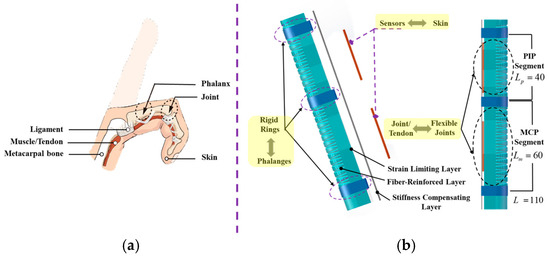 As in the anatomical diagram of the hand/finger in Figure 1a [27,28], the structure of the finger consists of phalanx/bone, joint, skin, muscle/tendon, and ligament. First, from the perspective of hand motor function, the phalanges have been linked with three joints: the MCP joint, the PIP joint, and the DIP joint. The tendon transforms the actuation force from the muscle to the corresponding finger joint. Second, from the ontological sensing function, the skin acts as a soft cushion, as well as the proprioceptor, which can guarantee non-destructive interaction and also provide perception information.