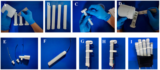 The main fabrication and assembly of the bioinspired SCPBAs are detailed in our previous study [27]. The inner elastomeric tube (2 mm thickness) is made of silicone elastomer (Dragon Skin 30, Smooth on Inc., Macungie, the U.S.) (Figure 2A,B). A single polyethylene thread (0.165 mm thickness, Yunshangpiao Co., Ltd, Jinhua, China.) is wound around the inner tube, forming the fiber-reinforced layer to provide radial constraint during the inner tube inflation, and a flexible but inextensible strain-limiting layer is attached to the bottom of the fiber-reinforced layer to construct the flexion motion. The strain-limiting layer is a piece of fabric strip 0.2 mm thick (Figure 2C). The outer skin silicone elastomer, 0.5 mm thick (Ecoflex 00-30, Smooth on Inc., Macungie, PA, USA), with a lower Young’s modulus than the inner tube fixes all components and provides a cosmetic appearance (Figure 2D). Three rigid rings, made of resin by 3D printing with mounting slots, are attached to the elastomeric body to keep these sections straight upon pressurization (Figure 2G). The stiffness-compensating layer with flexible bending sensors (FlexSensor 2.2/4.5, Spectrasymbol) is placed in the mounting slots (Figure 2H). Inspired by the anatomy of human fingers, we designed the index, middle, ring, and little fingers with three rigid segments and the thumb with two rigid segments, as shown in Figure 2E,F,I.