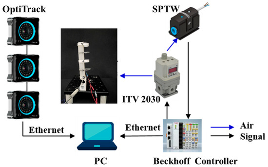 To evaluate the bending performance and verify the analytical models, the proposed SCPBAs were clamped vertically upward to inflate repeatedly, reducing the influence of gravity. As shown in Figure 5, a filter regulator (MS4-LFR-1/4, Festo Inc., Esslingen, Germany) was used to filter and limit the maximum value of input pressure by manual operation in the inlet. The pressurized air regulated from the proportional solenoid valves (ITV2030, SMC, Tokyo, Japan) was continuously adjusted and then flowed into the SCPBAs and pressure sensors (SPTW-P6R-G14-VD-M12, Festo, Esslingen, Germany) monitoring the channels’ air pressure in real time. The SCPBAs’ bending angles were monitored by commercial bending sensors (FlexSensor 2.2/4.5, Spectrasymbol, Salt Lake City, UT, USA) with the stiffness-compensating layer attached to the bottom of the actuator, which was calibrated by three optical cameras (Optitrack, NaturalPoint, Corvallis, Germany) based on the relative position of the reflective markers. For the embedded bending path of the sensors, a DC–DC converter module (input: 8–40 V, output 5 V/3 A, VG10-T24033, DearRoad, Beijing, China) and a simple series divider circuit were connected, and then the voltage changes at both ends of the bending sensors were indirectly acquired in real time. Data from the cameras were streamed to a PC by Motive and synchronized with the pressure signal and voltages with a Beckhoff controller. The inflation pressure was applied in steps of 40 kPa until it reached 180 kPa without failure.