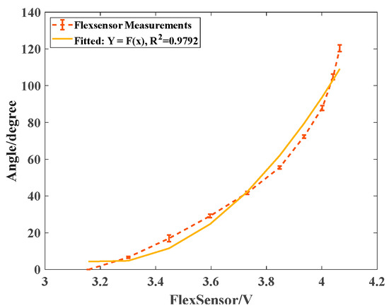 The bending angles of the sensors were captured by three cameras, calculated in Matlab 2018, and then plotted in Figure 6 (dotted line) with the corresponding voltages. The dotted line depicts the mean values of the real experimental measurements with the maximum and minimum errors, and the solid line indicates the fitted curve derived from experimental measurements. In Figure 6, the inset shows the fitted quadratic function model Y = 147.1068x2 − 947.1210x + 1528.2692 and the determination coefficient, R2 = 0.9792, of this sensor. The coefficient R2 was close to 100%, which indicated that the fitted model Y = f(x) matched the real scenarios, and then the bending kinematics were constructed in real time.