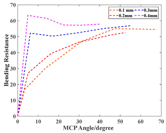In Figure 8, the lower bending resistance (BR) indicates that the actuator bends more easily with low pressure. Also, the thicker the stiffness compensating layer, the greater the corresponding bending resistance value. The maximum bending resistance value reached 63 when the 0.4 mm layer was integrated.