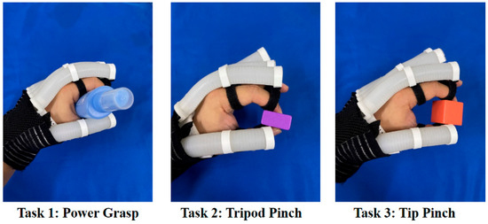 Several ADL tasks have been designed to help improve hand function and conducted to verify the validity of hand exoskeleton systems [9,10,12,22,26]. Three hand-grasping types, power grasp (all five fingers), tripod pinch (thumb, index, and middle fingers), and tip pinch (thumb and index fingers), are frequently used during ADL tasks, helping subjects with impaired hand function to complete ADL tasks and improve their quality of life. Thus, in this study, three ADL tasks—power grasping an elliptical bottle (task 1), tripod pinching a medium-sized cuboid woodblock (task 2), and tip pinching a small cubic woodblock (task 3)—were tested, as shown in Figure 10. These objects are common in standard hand function tests, such as the box and block test (BBT).