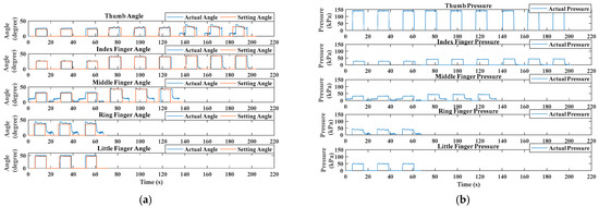 Figure 11 shows the bending angle and applied pressure as a function of time t (s) in the rehabilitation training trial for an able-bodied (AB) subject, which also represents the switch-mode rehabilitation from power grasp (task 1) to tripod pinch (task 2) to tip pinch (task 3). The solid blue curves represent the actual tracking bending angle of the involved fingers and the red curves show the corresponding targeted bending angles in Figure 11a. Figure 11b depicts the internally applied pressure for achieving the targeted angles.
