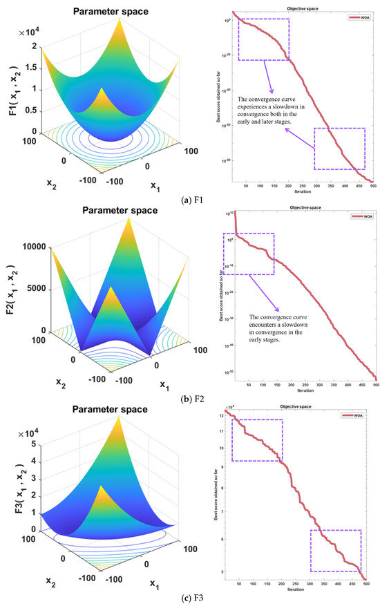 As depicted in Figure 2, the Whale Optimization Algorithm (WOA) exhibits a deceleration in convergence during both the initial and final phases. This phenomenon is detrimental to the algorithm’s capability for global exploration and local convergence, thereby adversely affecting the ultimate efficiency and accuracy of the algorithm. On the other hand, the WOA is susceptible to the influence of local optima in the early stages, leading to a decline in algorithmic precision.