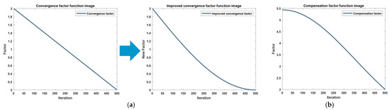 Within the framework of prey encirclement and bubble net assault, as articulated by Equation (4), it is imperative to recognize that individual whales amend their positional coordinates via the vector ‘A’ throughout the procedure. The modulation of vector ‘A’ exerts a profound influence on the algorithm’s capacity for global versus local exploration. Simultaneously, the coefficient vector ‘A’ hinges on the convergence factor ‘a’, which is characterized by a linear decrement from 2 to 0, as depicted in Figure 3a. To bolster the algorithm’s global search efficacy at inception and its local convergence precision at culmination, identifying an optimal convergence factor is paramount. This factor should manifest a robust value in the nascent iterations and a diminutive value in the terminal stages. However, a linearly descending factor does not align with the algorithm’s global and local search proficiencies. Conversely, the factor must evolve in tandem with the increment of iterations. Drawing from the extant literature [24], an adaptive factor is introduced, which is designed to be responsive to iterative fluctuations. Post the integration of this adaptive factor, the refined nonlinear convergence factor is articulated as presented hereinafter: