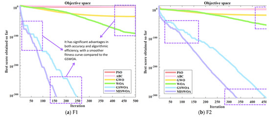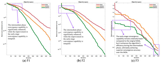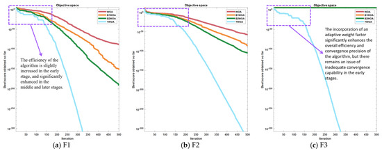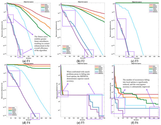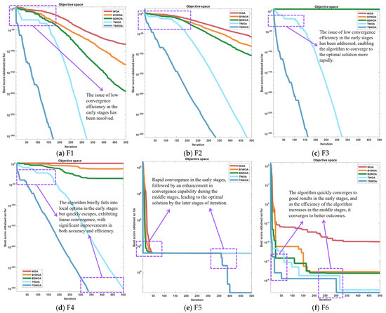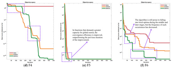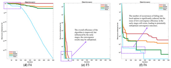 As demonstrated by the outcomes presented in Figure 4, an analysis was conducted based on the linearity of the convergence curve. Following the incorporation of an adaptive convergence factor, the algorithm’s curve exhibited a marked alteration in the later stages of iteration, effectively ameliorating the issue of poor convergence efficacy in the latter phases of the algorithm. However, during the initial and intermediate phases, the premature flattening of the convergence factor led to a decline in the algorithm’s capability for global search, resulting in the premature flattening of the convergence curve and even entrapment in local optima as depicted in Figure 4a–d during the early stages. It was also observed that in (f), the frequency of the convergence curve falling into local optima decreased, yet the algorithm still frequently becomes entangled in local optima during the early and intermediate stages, leading to suboptimal convergence accuracy.