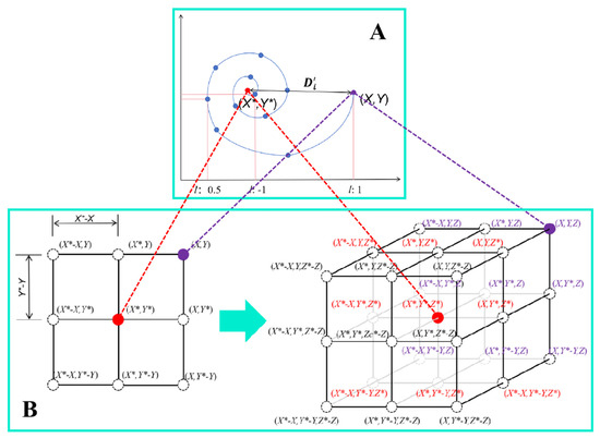 Spiral position updating and search space transformation. (A) the spiral convergence approach of whales within the search space (B) the transition of the search space from two dimensions to three dimensions.